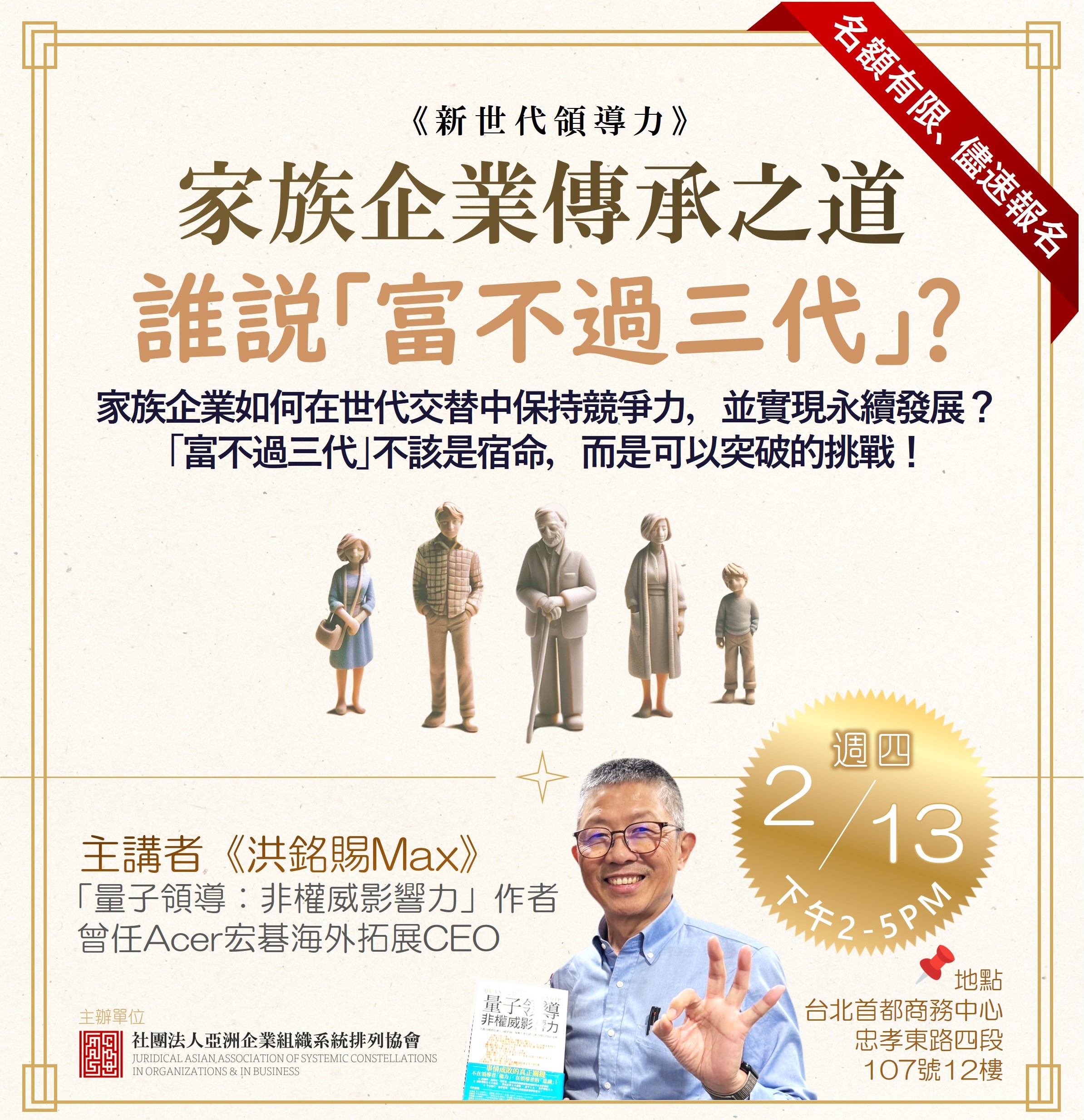本活動專為家族企業的接班人與經營者設計,透過創新思維、治理架構及量子領導等方法,幫助企業打造長青基業。