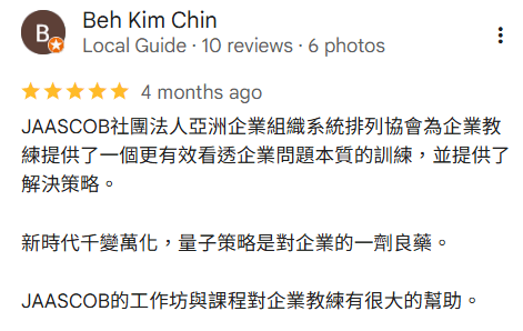 JAASCOB 為企業教練提供了一個更有效看透企業問題本質的訓練,並提供了解決策略。 新時代千變萬化,量子策略是對企業的一劑良藥。 JAASCOB的工作坊與課程對企業教練有很大的幫助。
