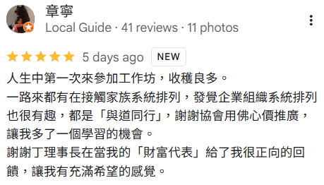 參加了一日的體驗課,在過程裡面體驗到非常多的能量的流動,也看見了自己與不同的人事物互動的能量狀態,可以更客觀的看見自己的盲點的同時能夠知道如何找到對自己當下最適合的答案,超級喜歡今天的課程