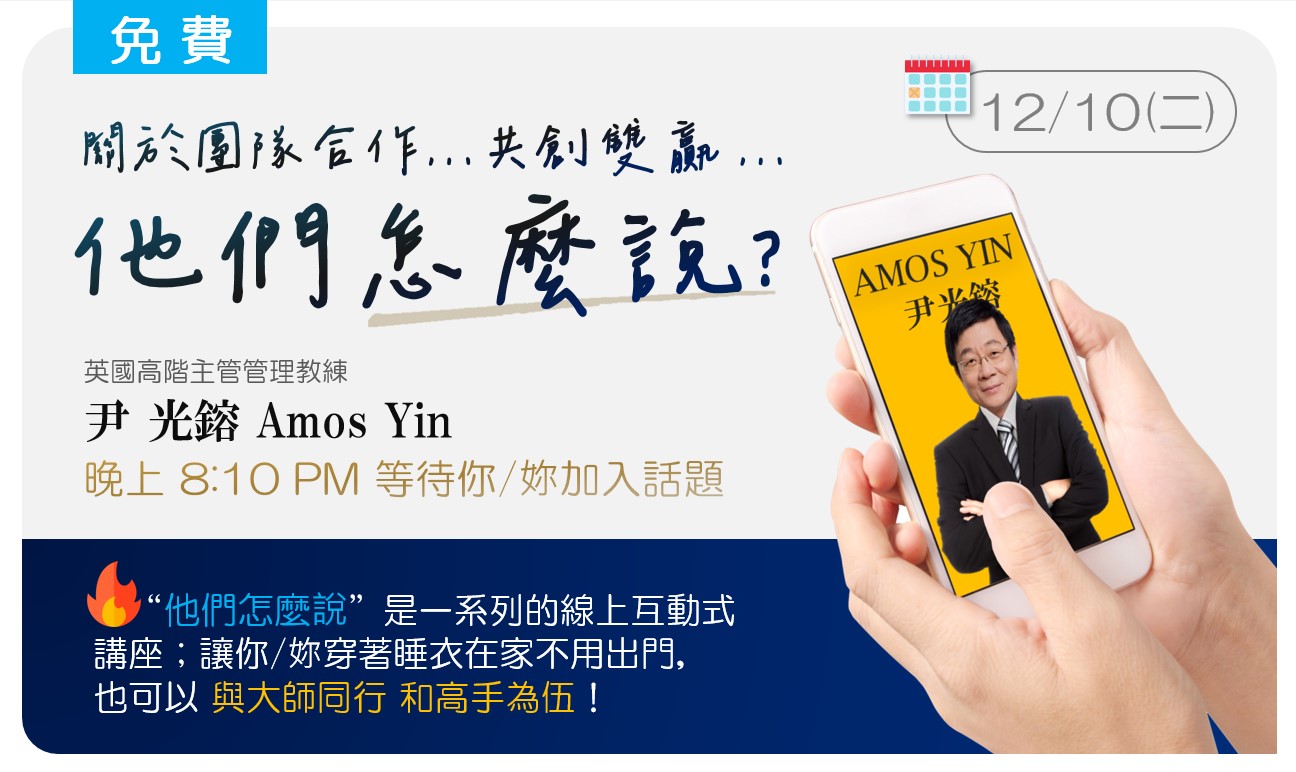關於團隊合作…共創雙贏…聽聽看英國高階主管管理教練「尹光鎔」怎麼說吧!報名線上互動式講座