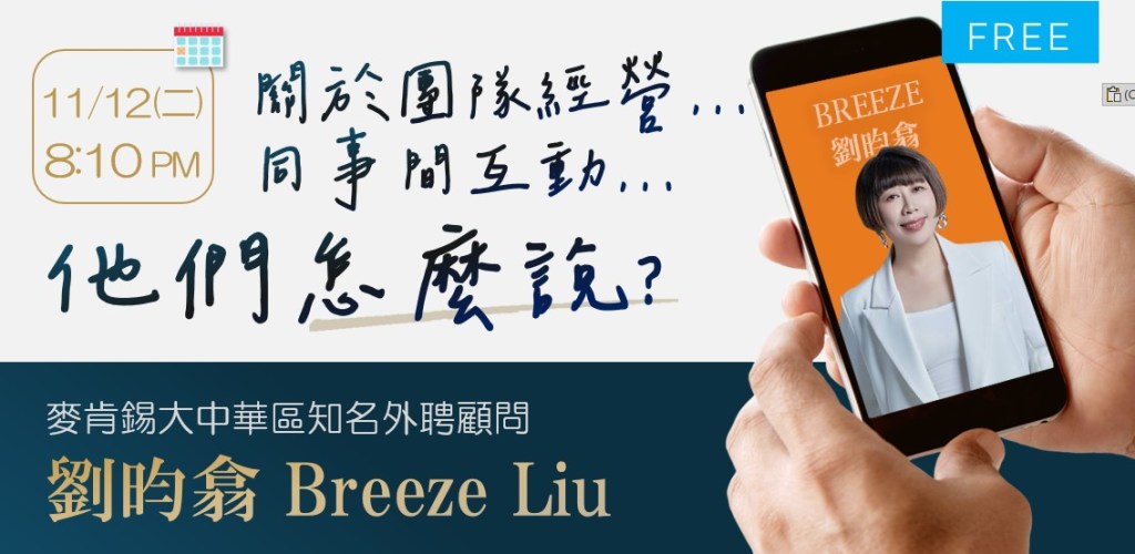 關於團隊經營…同事間互動…聽聽看麥肯錫大中華區知名外聘顧問「劉昀翕」怎麼說吧!回放已開放~