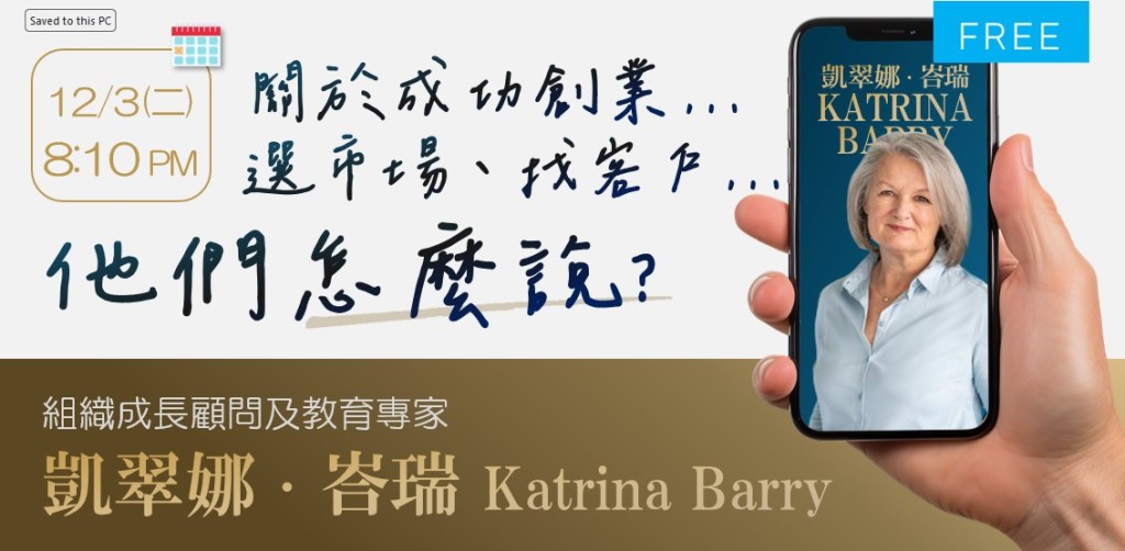 關於成功創業…選市場、找客戶…聽聽看組織成長顧問及教育專家「凱翠娜‧峇瑞」怎麼說吧!回放已開放~